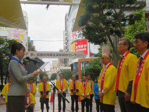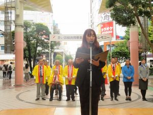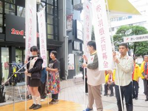 続いて、センダイガールズプロレスリング(仙女)里村明衣子社長及び一般社団法人アート・インクルージョンの皆様による運動開始宣言が行われたあと、さっそく募金の呼びかけをおこないました。